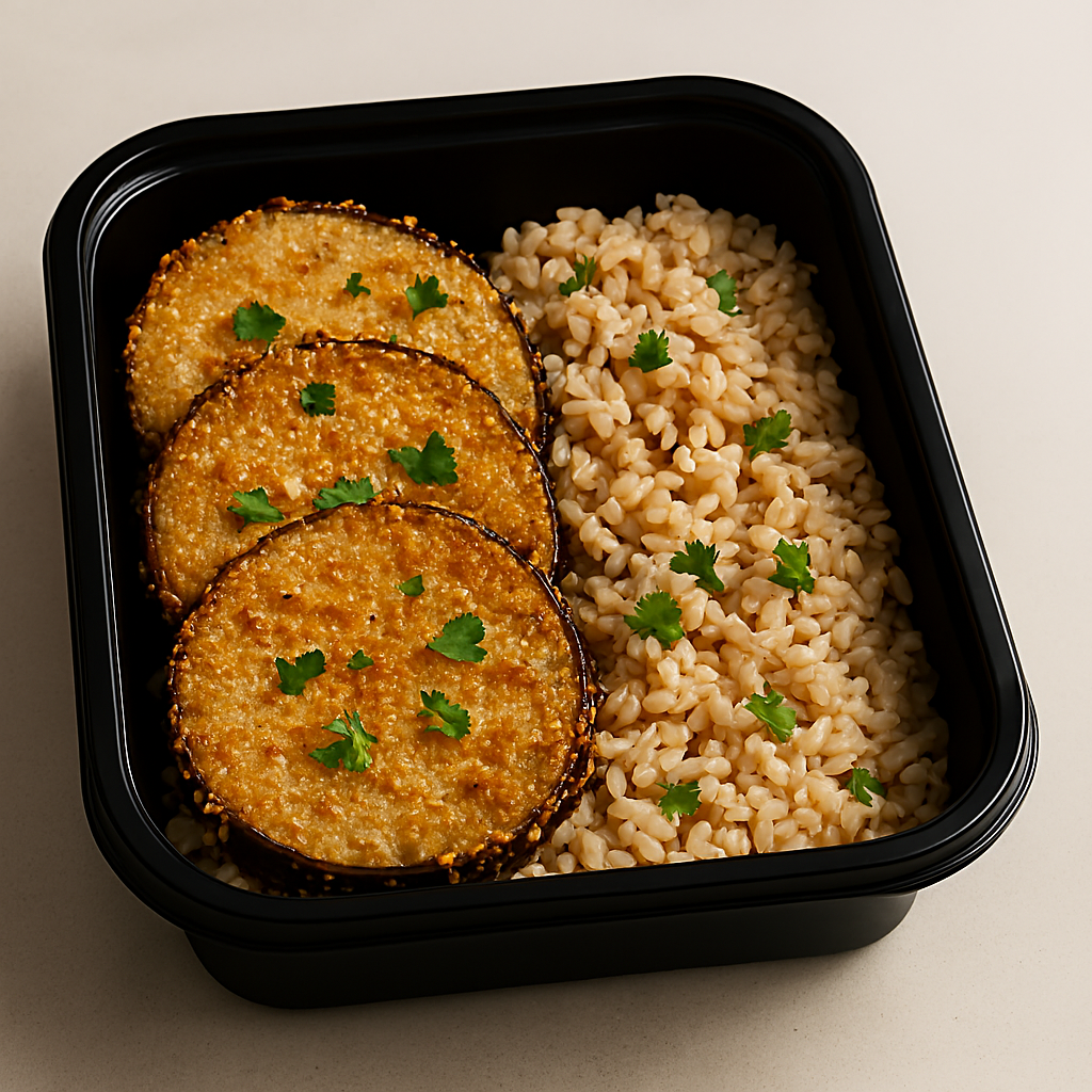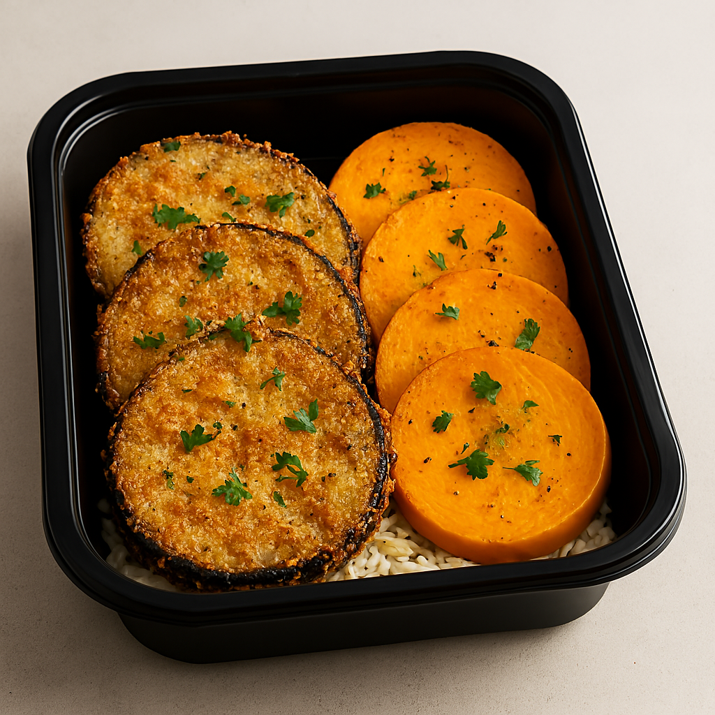 Milanesas de berenjena al horno, con discos de calabaza o arroz integral.